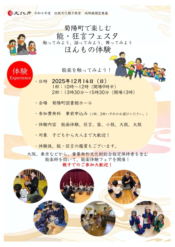 12月14日(日)「菊陽町で楽しむ能・狂言フェスタ」。能面をかけたり能で使用される楽器を体験できます。プロによる実演もあります。ぜひご参加ください。お申込みはチラシ記載のQRコードからどうぞ。よろしくお願いいたします。