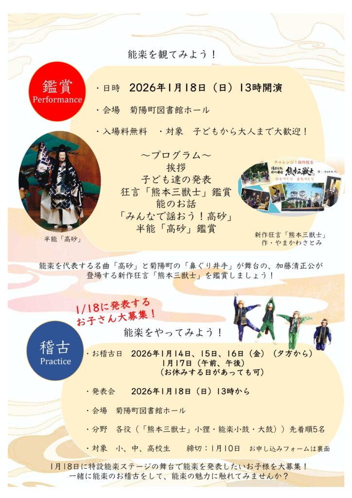 お知らせ12月14日(日)「菊陽町で楽しむ能・狂言フェスタ」。能面をかけたり能で使用される楽器を体験できます。プロによる実演もあります。ぜひご参加ください。お申込みはチラシ記載のQRコードからどうぞ。よろしくお願いいたします。
