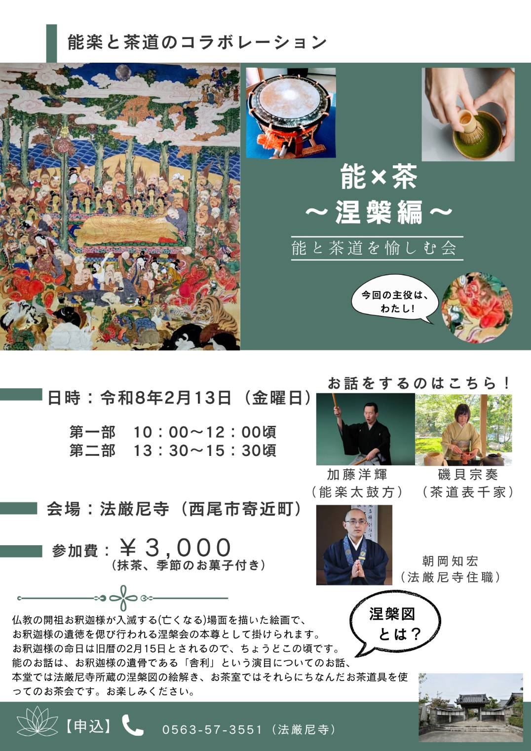 2月13日(金)西尾市で茶道とのコラボイベント「能×茶」。おかげさまで第3回目を迎えることができました。今回は能「舎利」をテーマにおこないます。お釈迦様の命日とされる2月15日は、お釈迦様の入滅を描いた涅槃図をかけてその遺徳を偲びます。この涅槃図のなかに舎利を盗んだ足疾鬼が描かれています。法厳尼寺所蔵の涅槃図をご住職に絵説きしていただき、おいしいお茶とお菓子で涅槃の世界を楽しんでいただけます。ぜひお越しください。